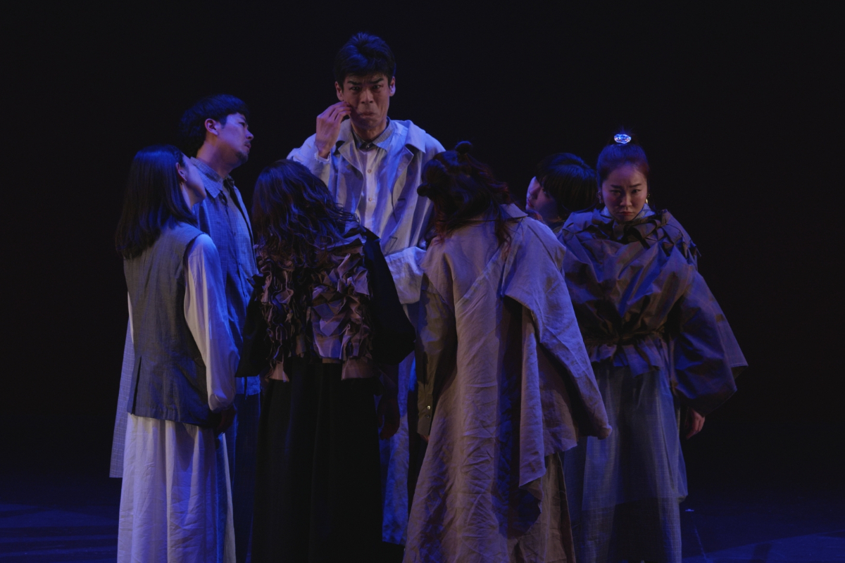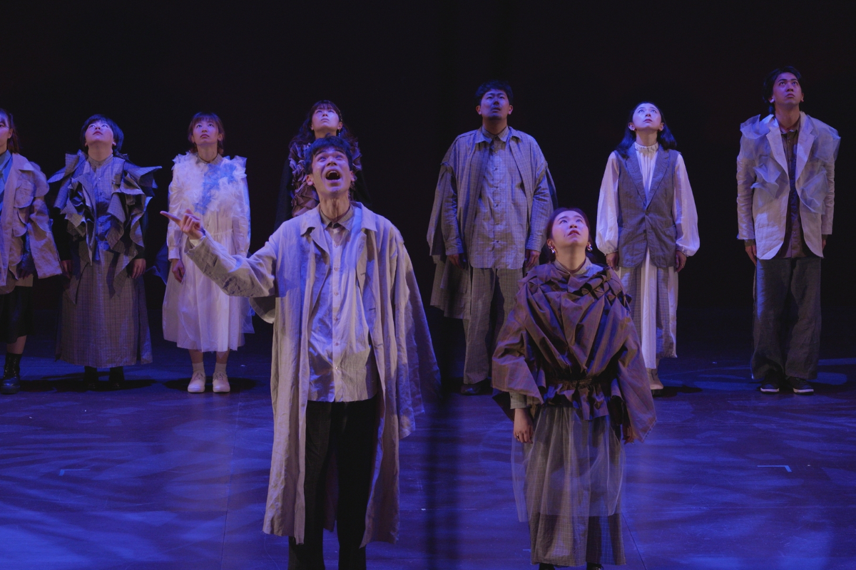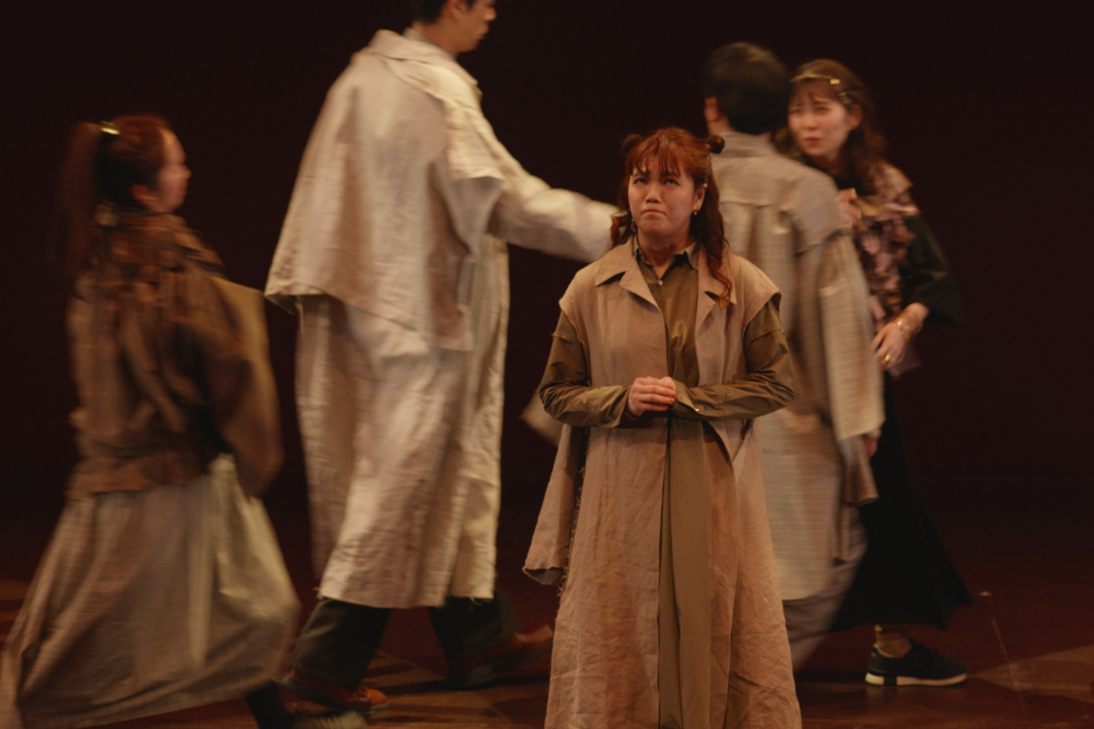 その瞬間、突風。顔を臥せる人々の影が蜃気楼のように舞台に現れる。風が収まると中心にギザがいる。