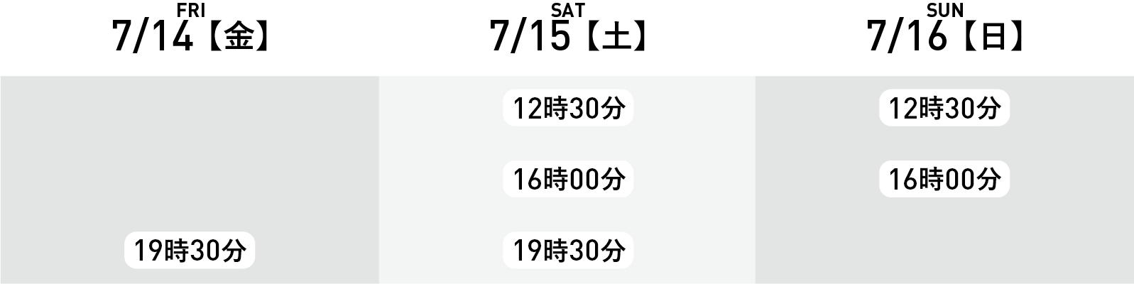 ※全て開演時間です。受付開始は開演時間の40分前、開場は30分前です。