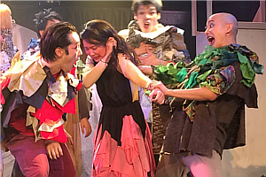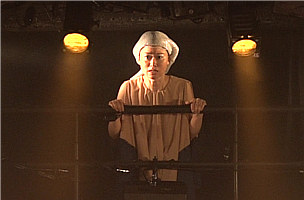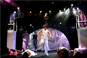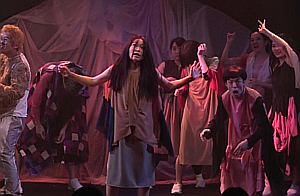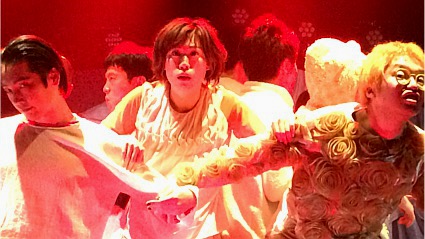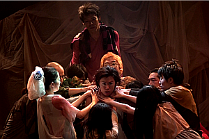 明かりが変わると、ドタバタと走り回っていた群衆が、バタリとその場に倒れ込む。まるで、死体の群れのように。