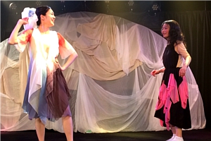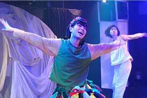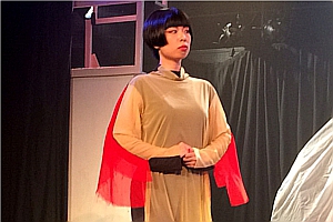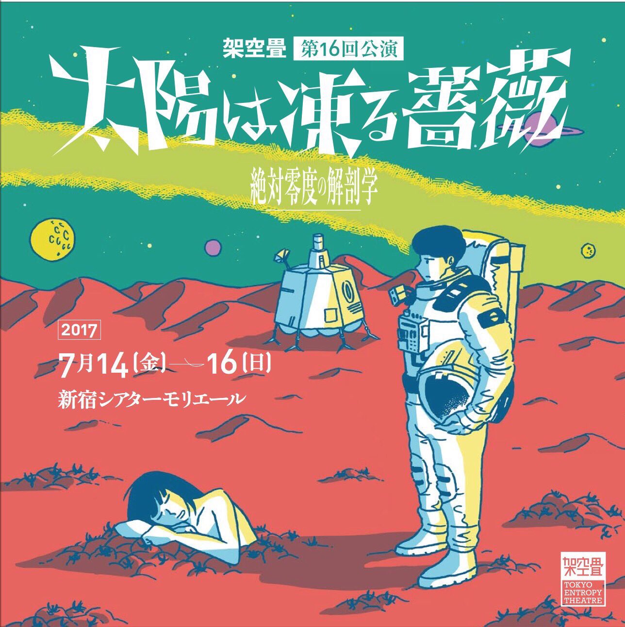かもめ アテンション、プリーズ。地上より垂直に62.1マイル、海抜100キロメートル上空に引かれましたる、カーマンライン。大気圏と宇宙圏との境目より今、開演のアナウンスを務めますワタクシ、通信衛星の「かもめ」でございます。え、一口に100キロメートルと申しましても、それが垂直か?平行か?X軸かY軸かのプランニングによりまして、ご予算のほうも大きく変わって参りまして、垂直ですと、値切りに値切って100億円、けれど仮にそれが平行であったなら、100キロメートルはホンの目と鼻の先、東京から熱海、1980円の道のりでございます。どうぞご予算と重力との折り合いをソイヤとつけまして、きっとまた再び、お芝居の中でお会い致しましょう。…私はかもめ。また、会うかもね。