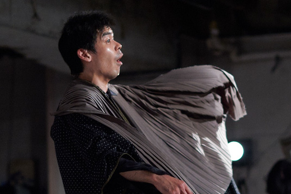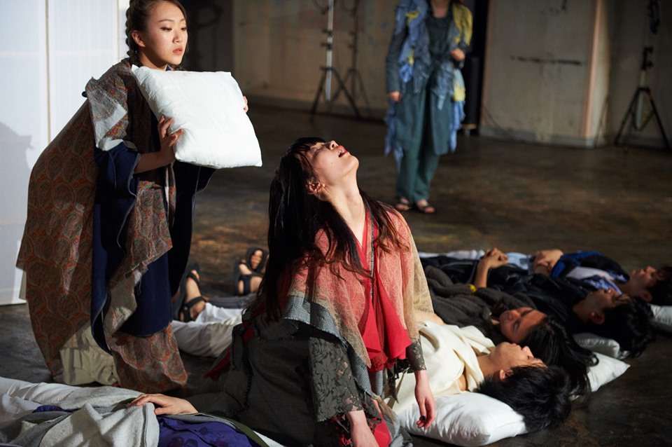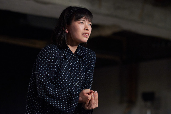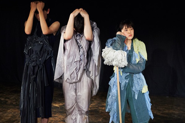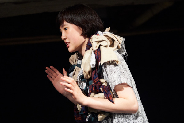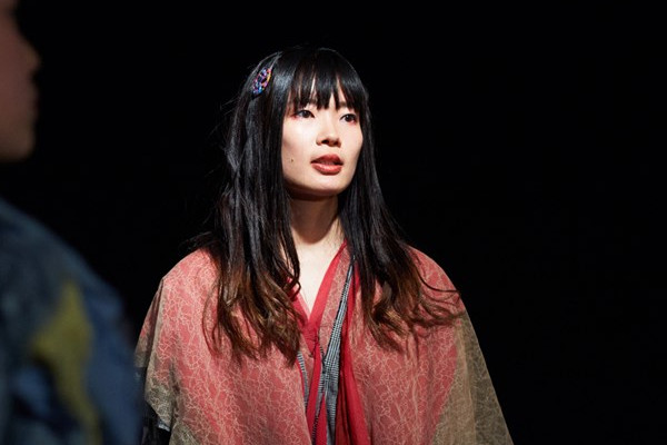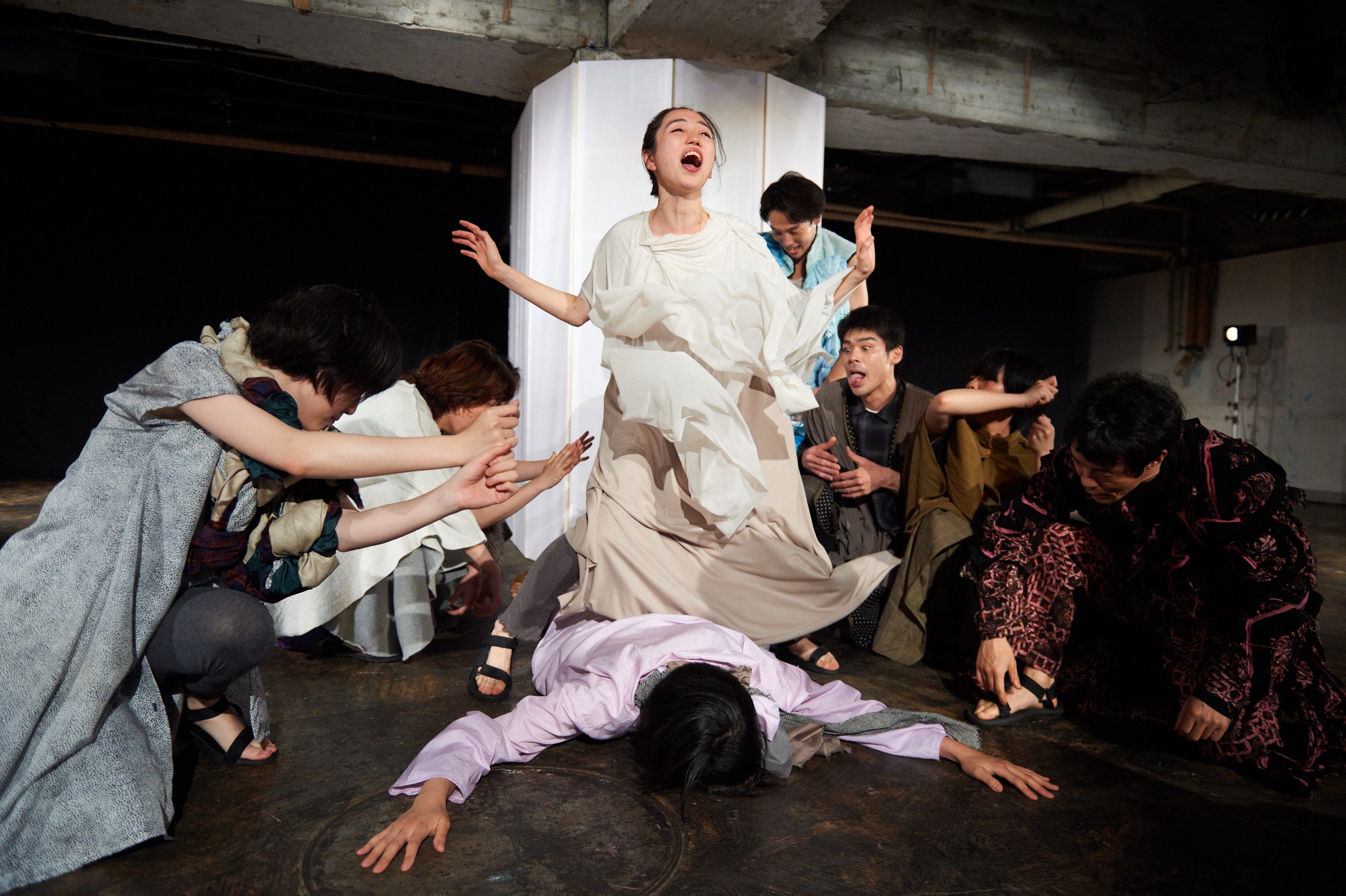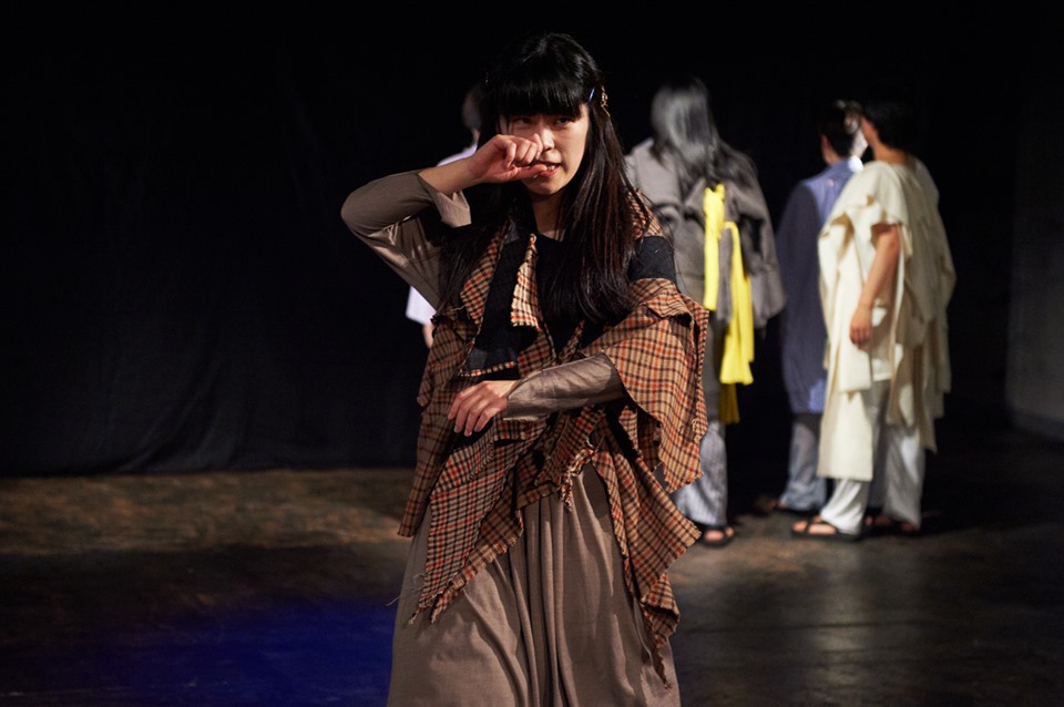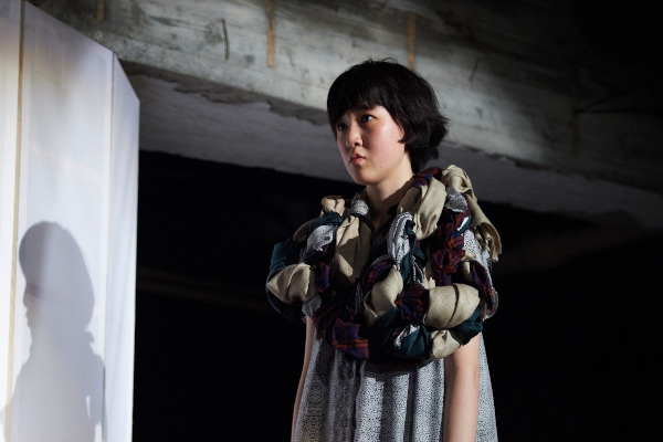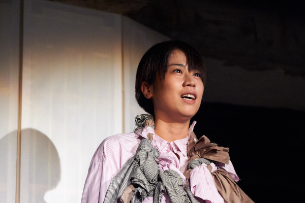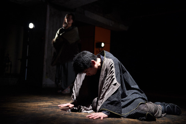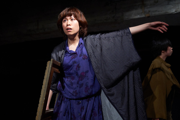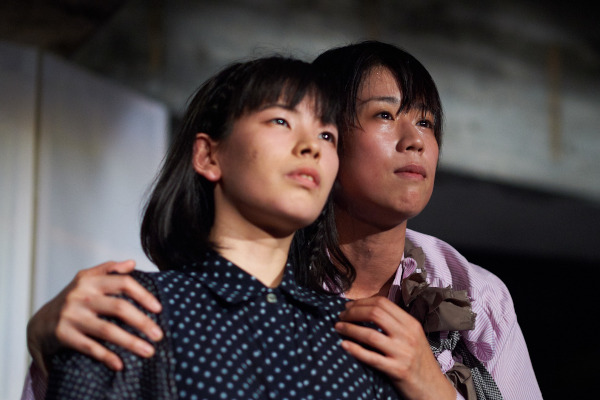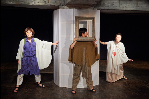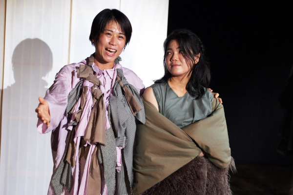 イスメネと繭子、一本の柱の左右にそれぞれの手をあてて、対称的に対峙する。