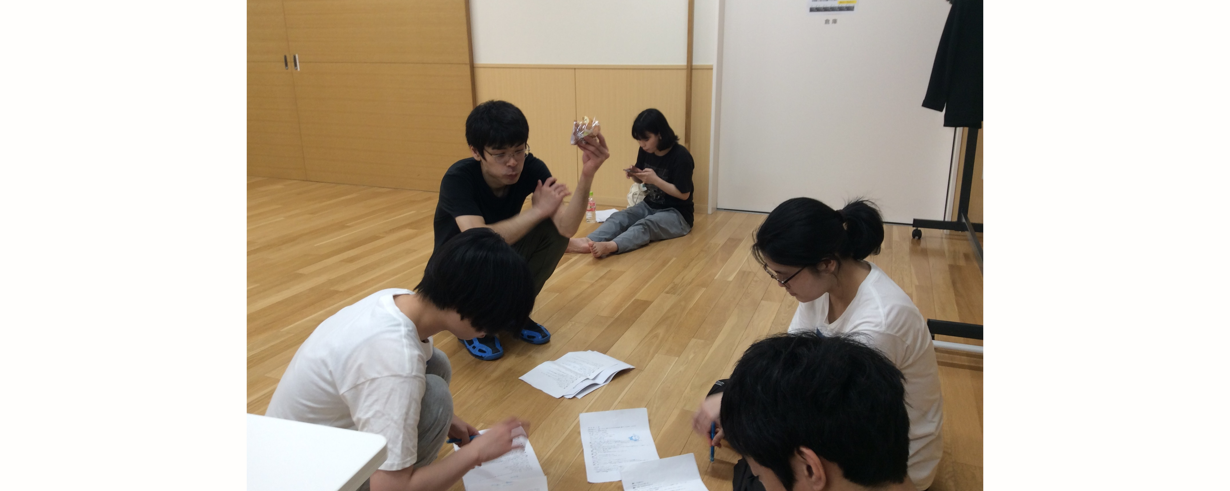 ●前回の稽古を踏まえて、 あらためて芝居のコンセプトというか、どういう見栄えにしたいのか ということを話しまして。 非常に抽象的なことを、どれくらい単純に、具体的にしていくか 稽古場に向かう途中は結構、時間かかるかな、大変かな って思ってたんですけどね。 やはり、私の無茶、出鱈目には耐性のある人々ですので あっという間に対応してくれました。