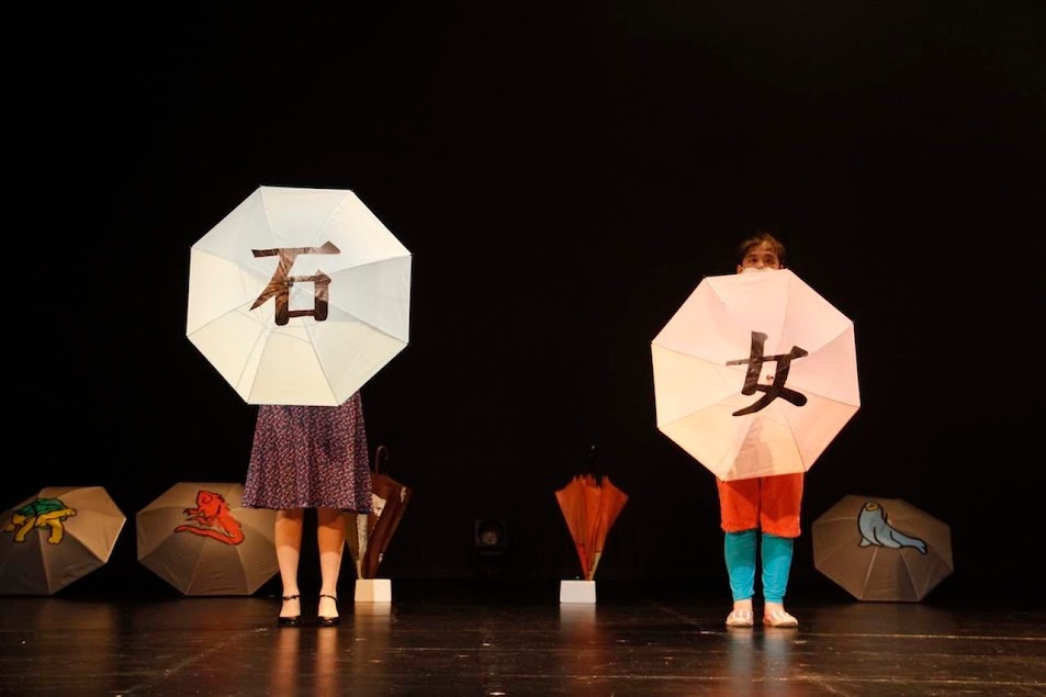 雨粒の音。それぞれ「誰」「彼」という一文字が書かれ2本の雨傘が浮かび上がる。「誰」の傘を持った女が、歌を詠む。