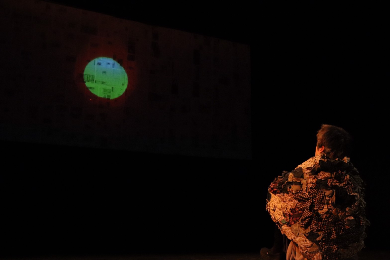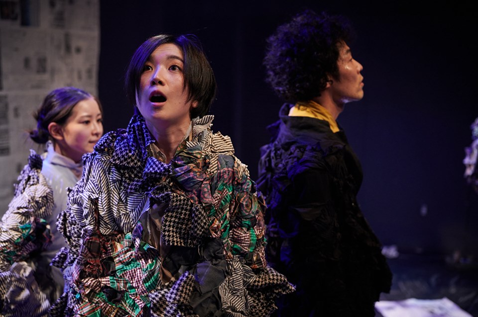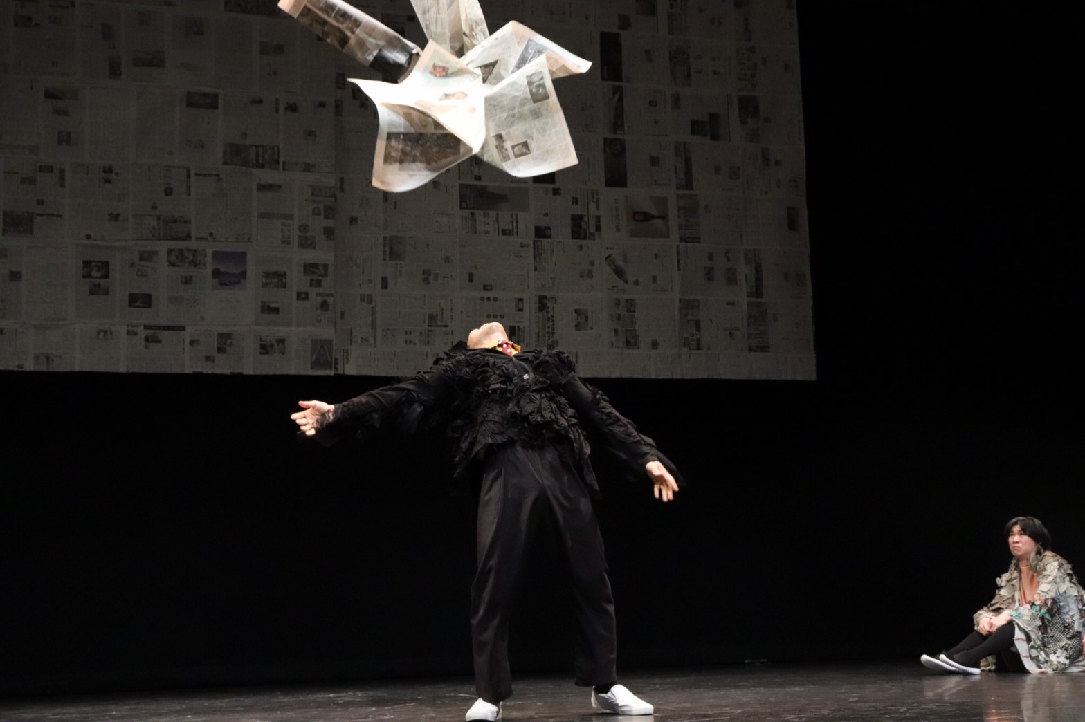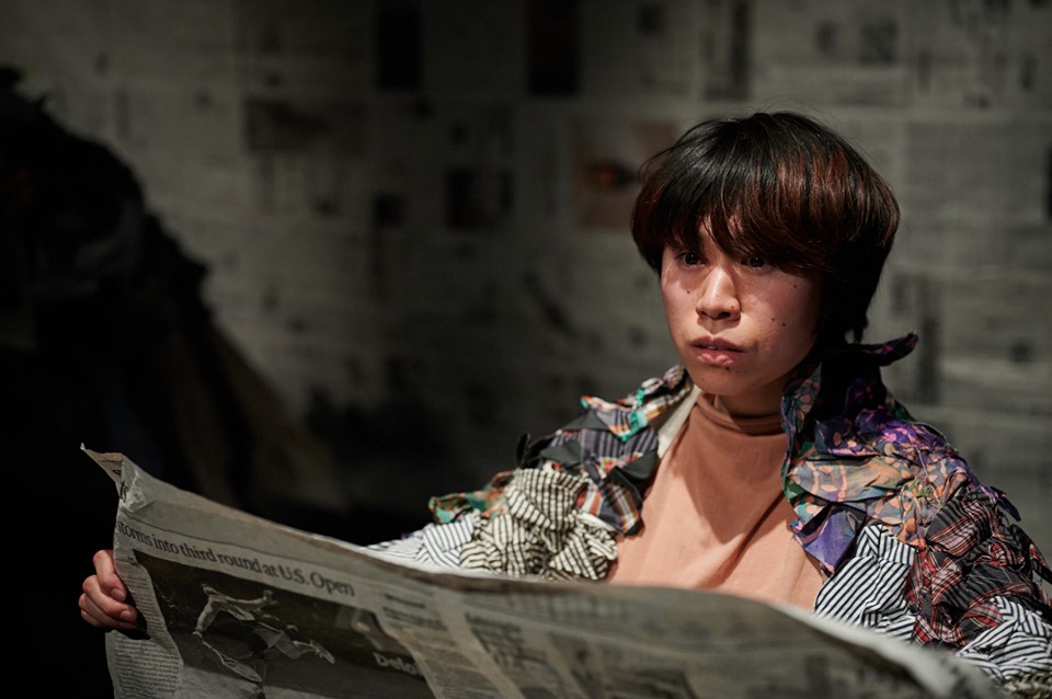 澄香、ホゾ宮の首に手をかけ部屋の中で引き込むと、たちまち闇に包まれる。闇の中で新聞紙がガサガサと動く気配。