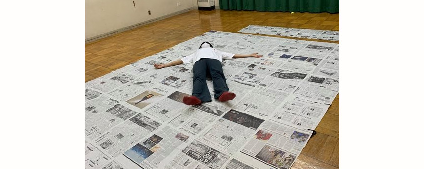 江花さんが頑張って作ってくれた新聞紙大幕を実際に吊ってみて、イロイロと調整。