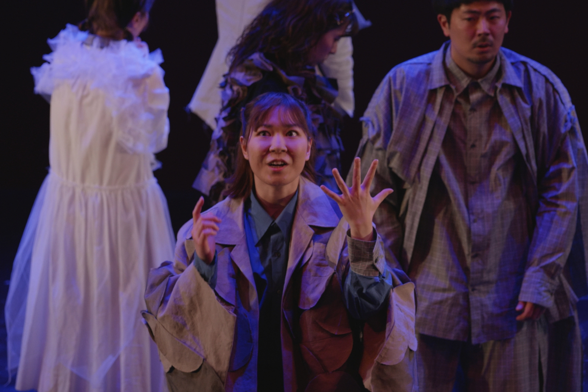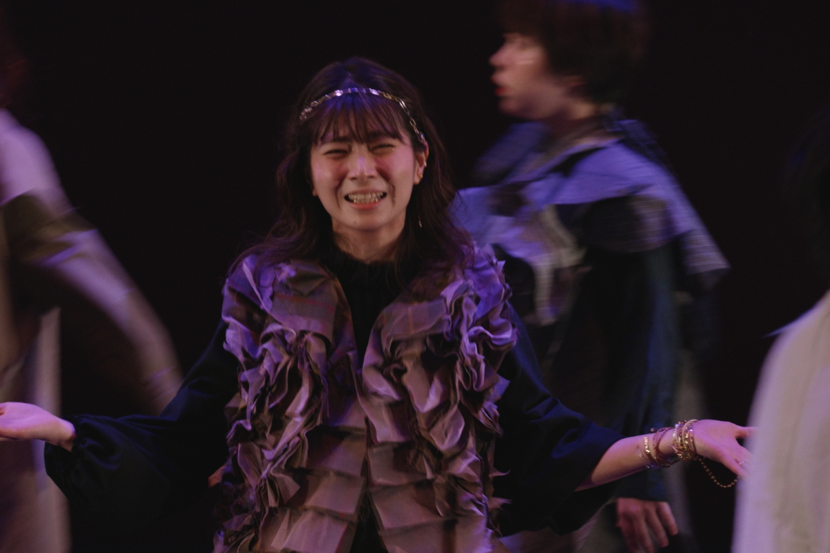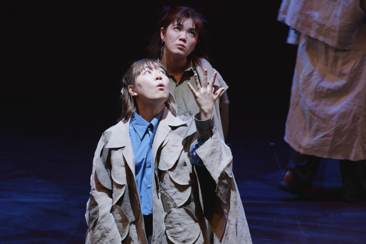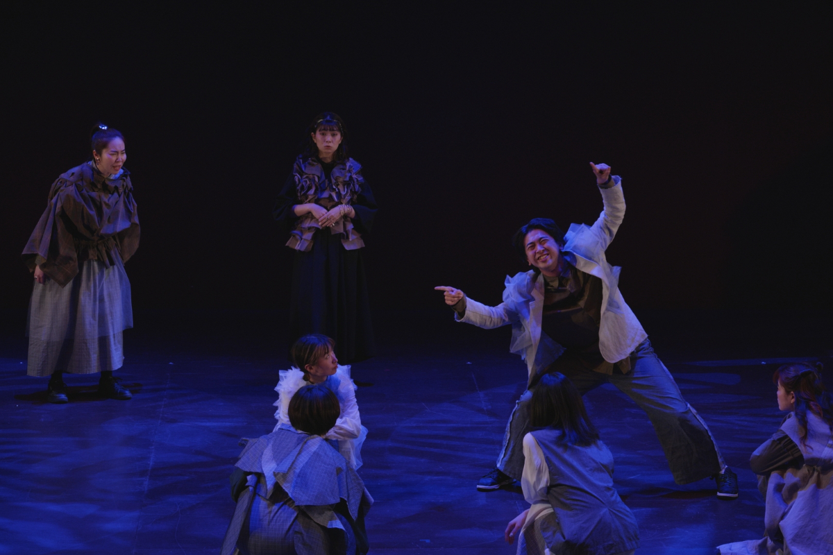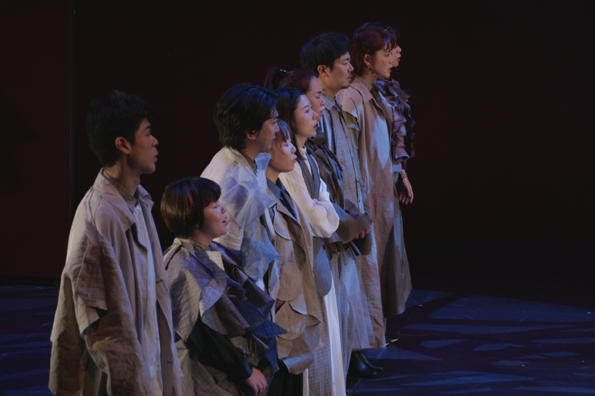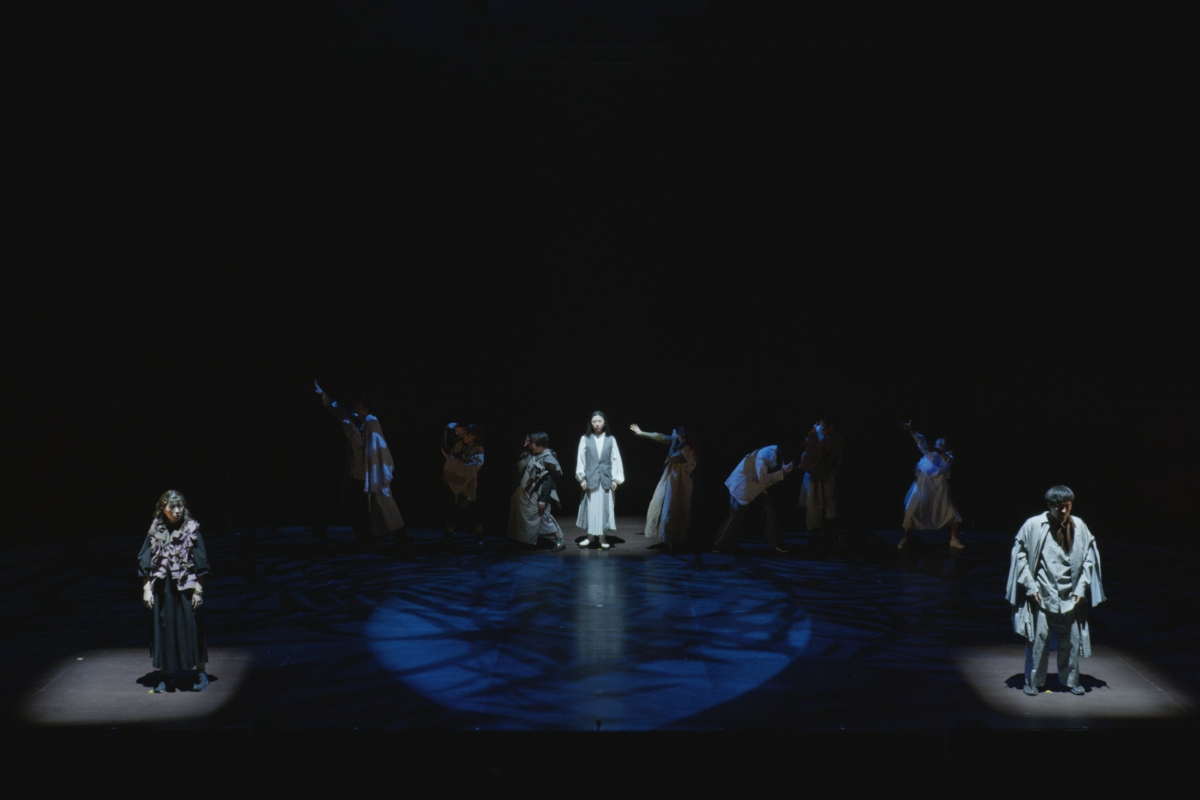 その瞬間、突風。顔を臥せる人々の影が蜃気楼のように舞台に現れる。風が収まると中心にギザがいる。