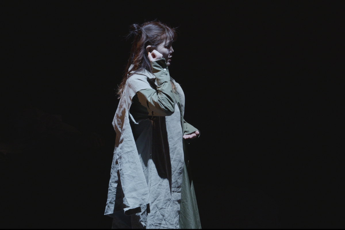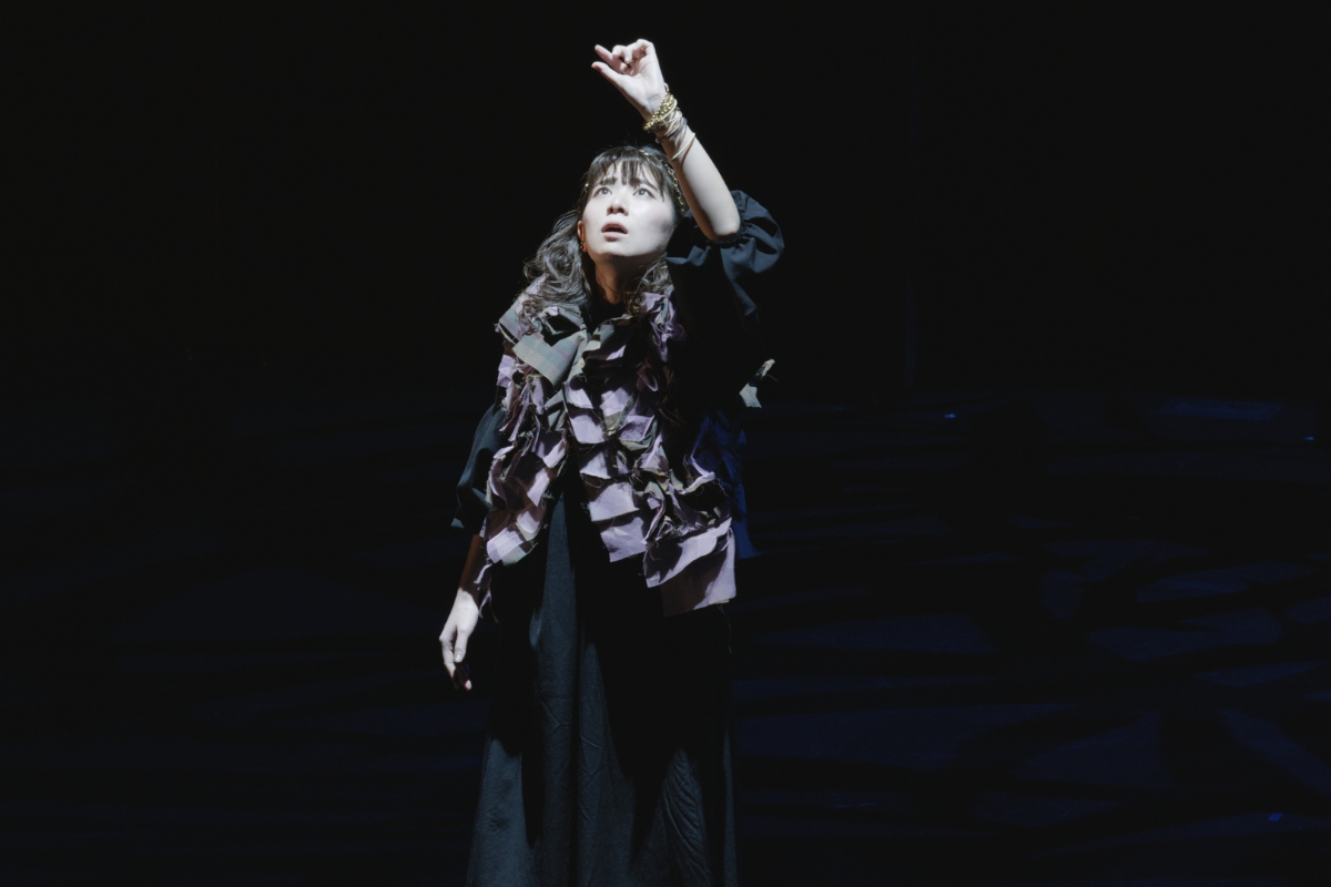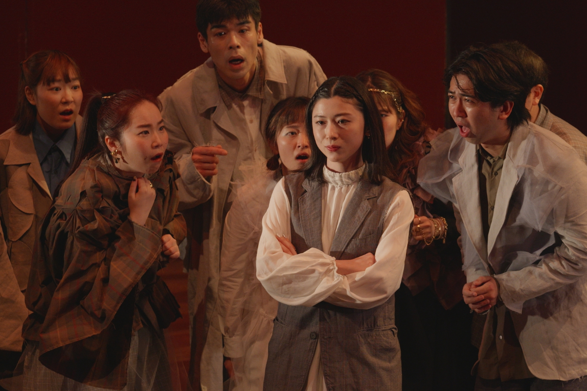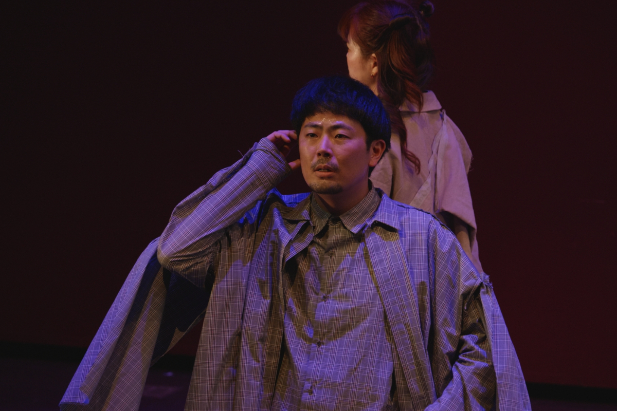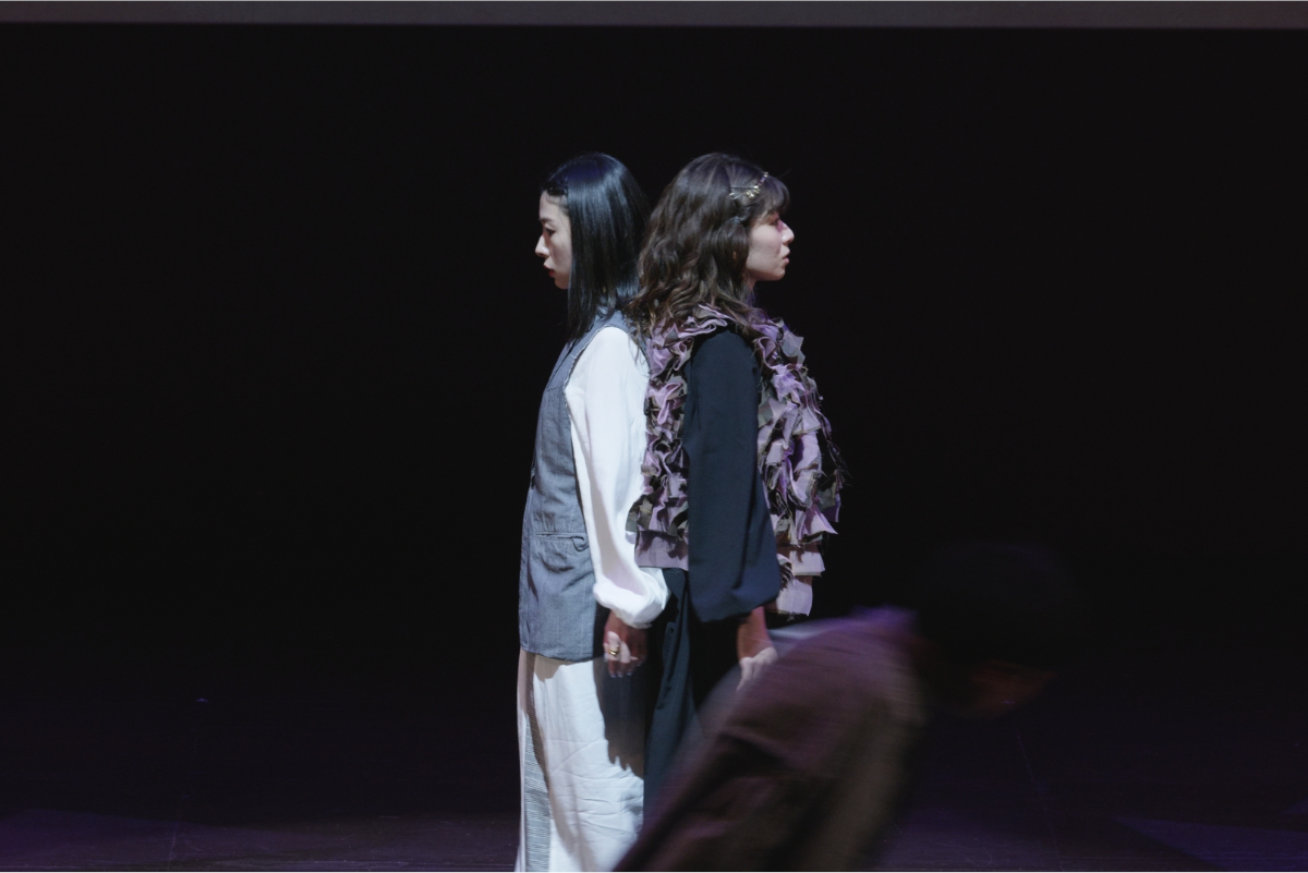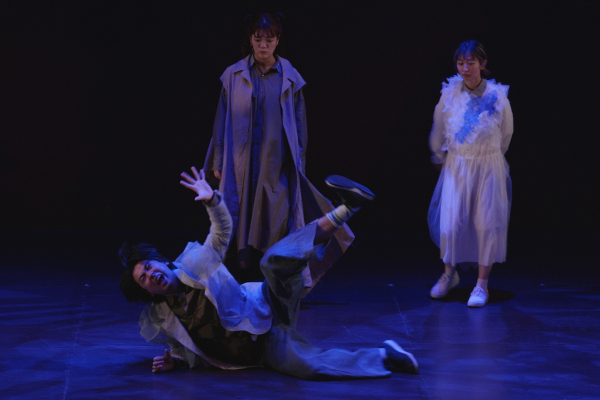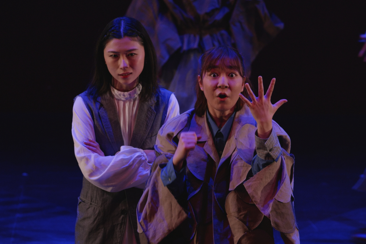 その瞬間、突風。顔を臥せる人々の影が蜃気楼のように舞台に現れる。風が収まると中心にギザがいる。