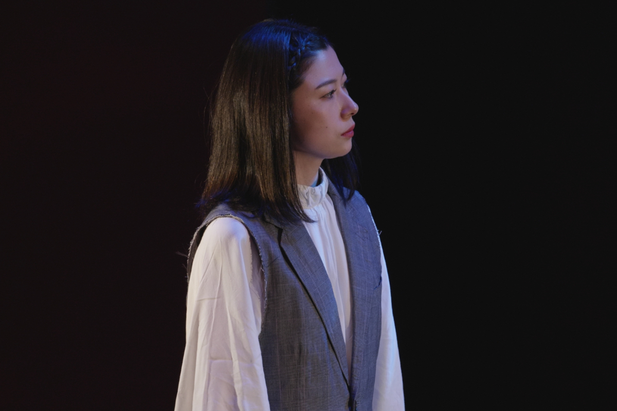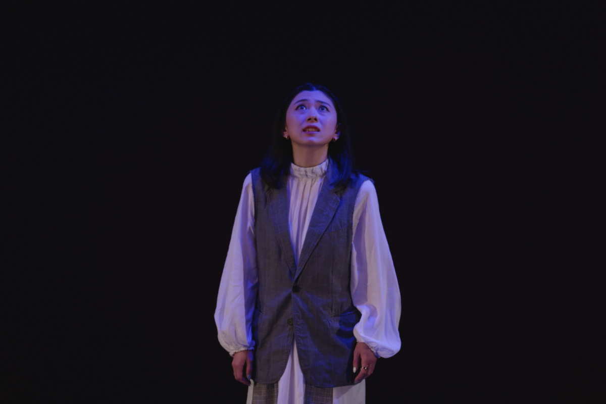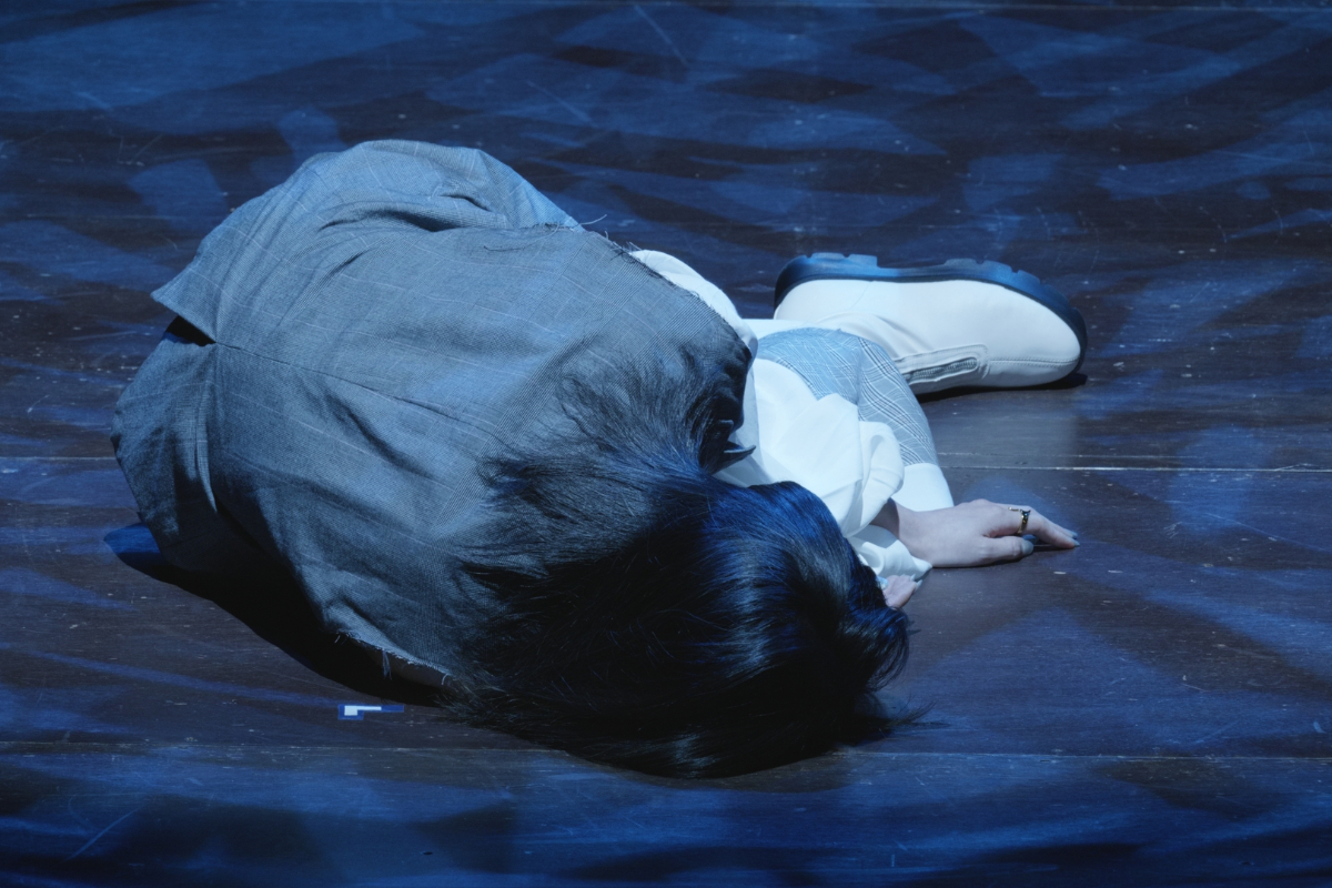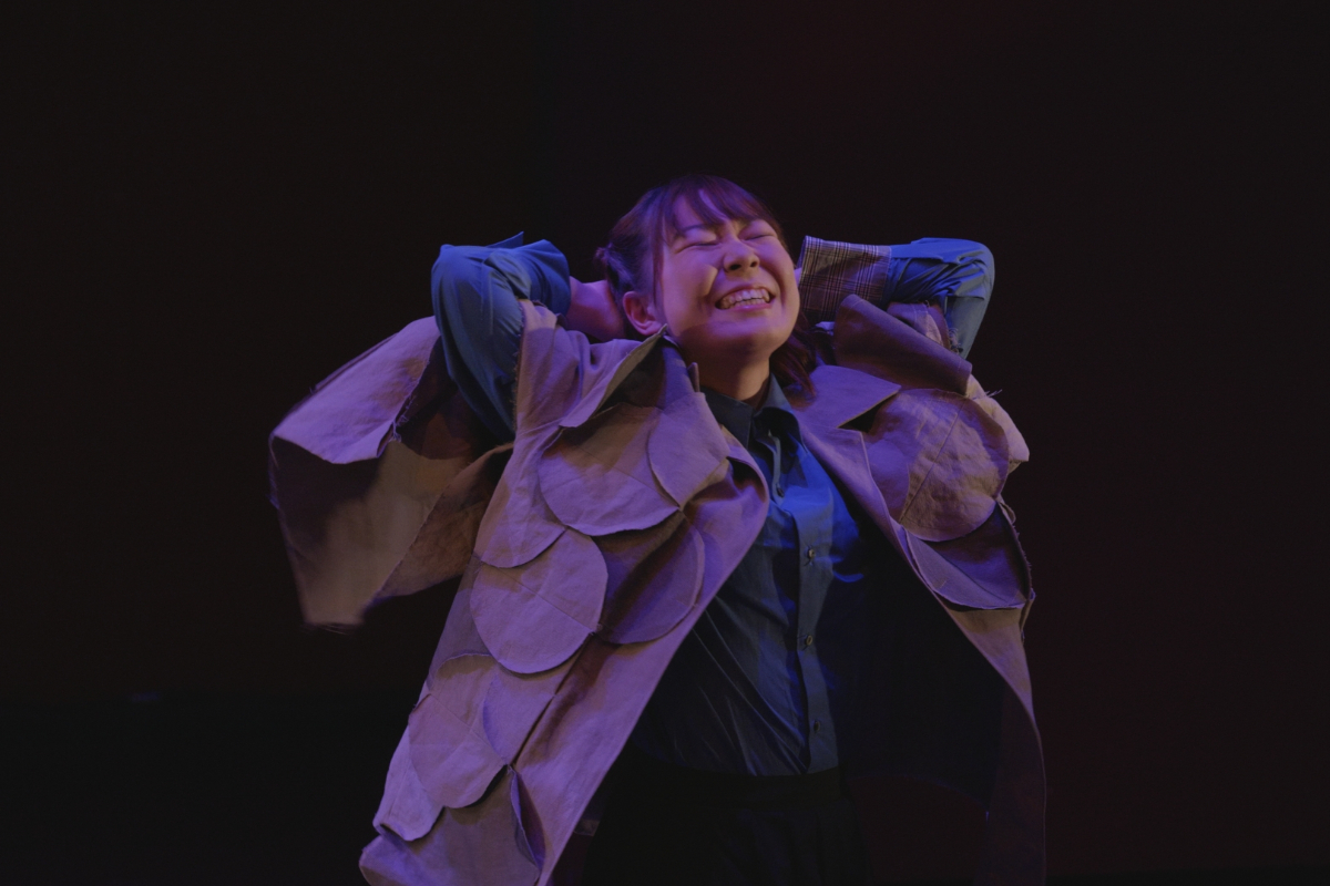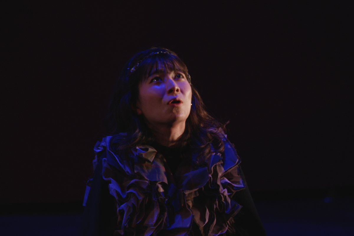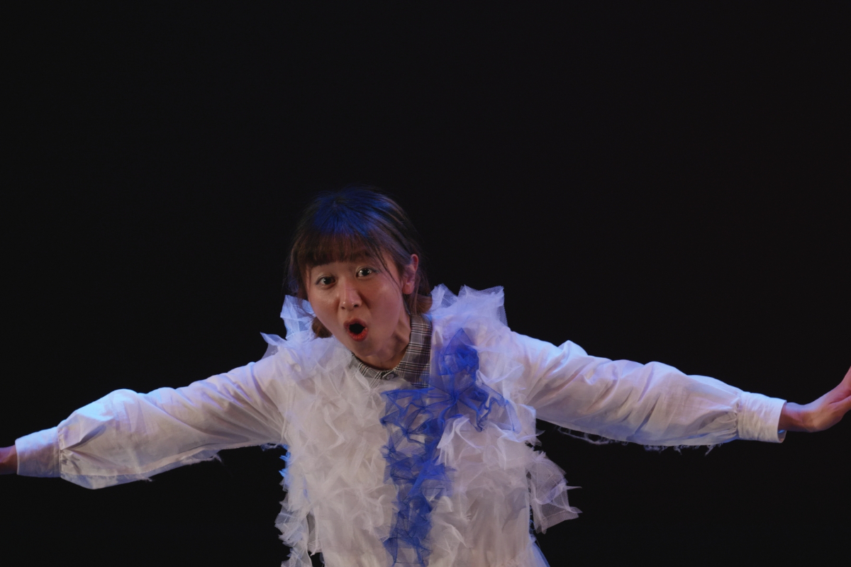 その瞬間、突風。顔を臥せる人々の影が蜃気楼のように舞台に現れる。風が収まると中心にギザがいる。